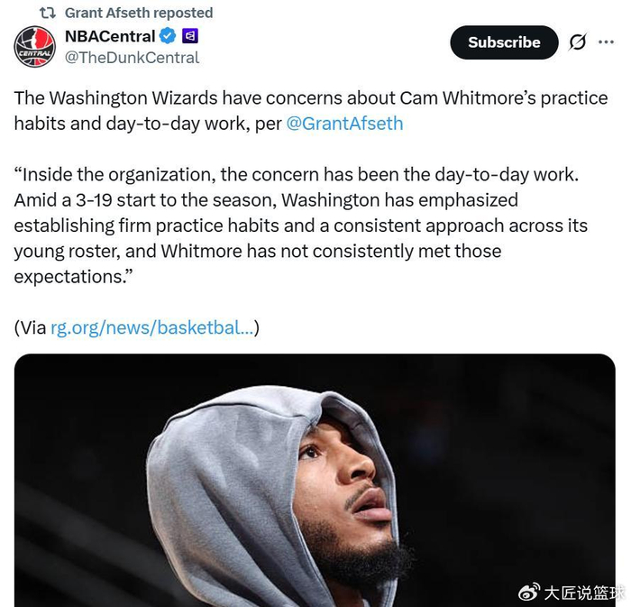 美记Grant Afseth也跟进曝出,相比于肢体语言、防守失误和投篮选择这些显性问题,奇才教练组更加担忧白魔日常训练的表现与态度。